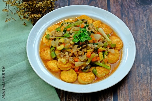 Deep fried tofu with gravy sauce (Tao Hoo Song Kreung) in white plate on wooden table, Healthy dish.