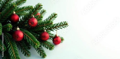 Deep green fir branch draped with shimmering red and gold baubles , cone, Xmas
