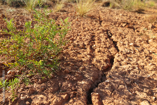 Deeply cracked red clay hill slope with a scarce vegetation