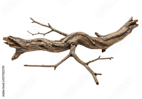 Deeply weathered, gnarled, twisted tree branch with dark browns, charcoal greys, cracks, knots & delicate offshoots, isolated on a clean white background, no shadows, high-key light, concept of