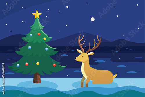 cervid, christmas, reindeer, animal, vector, winter, illustration, christmas, holiday, snow, cartoon, tree, silhouette, nature, wild, snowflake, card, season, mammal, design, antler, elk, landscape, cute, art