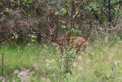 Deer walking through tall grass at forest edge, wildlife in natural habitat