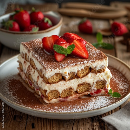 Delectable Homemade Strawberry Tiramisu on Rustic Wooden Table