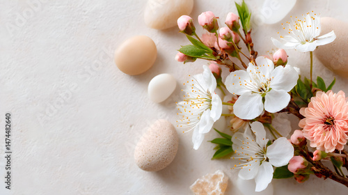 Delicate arrangement of spring flowers and smooth stones on a light textured surface, creating a serene and calming atmosphere for relaxation. Selective focus