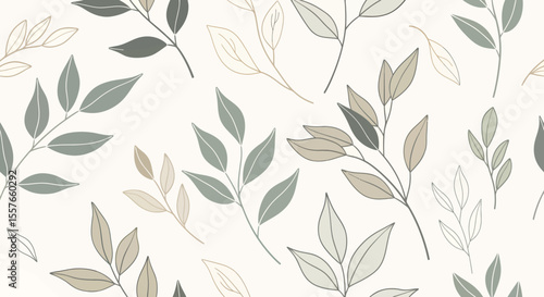 leaf, leaf, foliage, tree branch, branch, botanical, pattern, seamless, repeat, design, nature, plant, flora, floral, drawing, illustration, art, artistic, stylised, decorative, element, graphic, surface, textile, wallpaper, background, texture, neutral, muted, beige, brown, green, outline, organic, elegant, simple, minimalist, modern, contemporary, trendy, aesthetic, fabric
