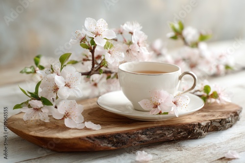 Delicate Cup of Tea Surrounded by Cherry Blossom Flowers