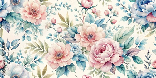 Delicate, dreamy watercolor floral print featuring soft pink and blue blooms on a creamy white background, evoking a sense of vintage elegance and whimsy.