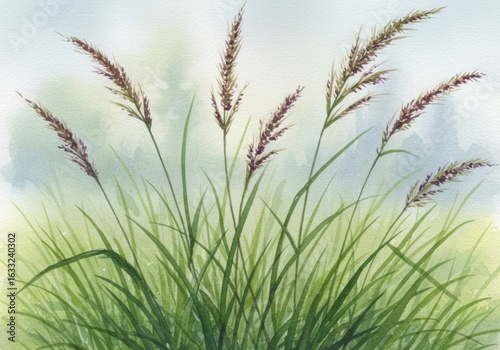 ornamental, grass, plant, nature, botanical, floral, garden, meadow, field, green, feathery, seed, head, blade, tall, wildflower, pasture, summer, spring, autumn, season, outdoors, landscape, background, texture, detail, watercolor, painting