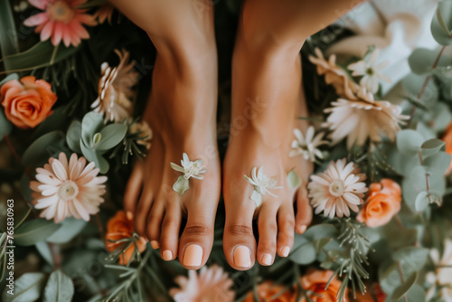 Delicate feet nestled among a lush tapestry of flowers and greenery, symbolizing natural beauty and the art of pedicure care. Floral Foot Beauty