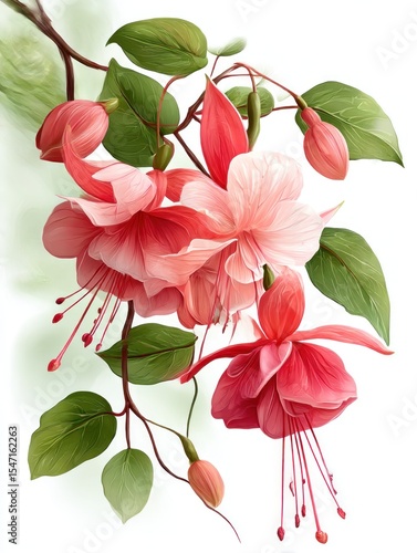 flower, fuchsia, bloom, tree branch, leaf, soft, pastel, pink, red, nature, illustration, art, detail, romantic, spring, botanical, vibrant, gentle, elegant, hanging, beauty