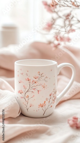 Delicate Floral Mug on Soft Fabric with Gentle Natural Lighting