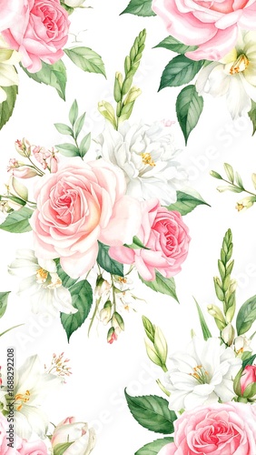 floral, pattern, rose, pink, white, bouquet, leaf, sprig, green, watercolor, delicate, seamless, botanical, spring, summer, elegant, romantic, pretty, flower, lush, vibrant, fresh, vintage, soft, gentle, nature, art
