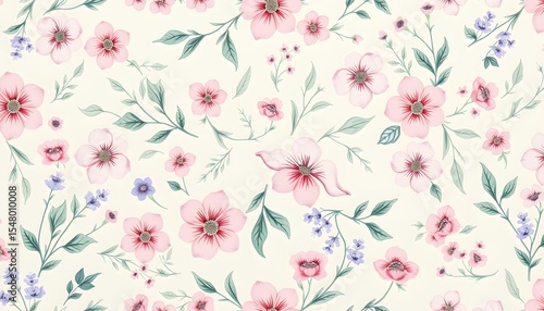 Delicate floral pattern showcasing pink blossoms and green foliage against a light background.