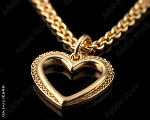 Delicate gold heart pendant hangs gracefully on a stylish chain, capturing light beautifully. The contrast against the dark background enhances its exquisite shine, making it a perfect accessory
