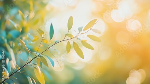 Delicate green leaves bask in golden sunlight, casting gentle shadows on a blurred, bokeh-filled background symbolizing nature's tranquility.