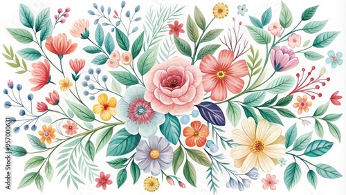 Delicate, hand-drawn floral design featuring colorful blossoms, tendrils, and leaves on a soft, white background, perfect for feminine, elegant, and nature-inspired print designs.