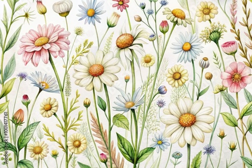 Delicate, hand-drawn illustrations of small flowers, including daisies and wildflowers, in soft colors and gentle lines, on a crisp white background, evoking a sense of whimsy.