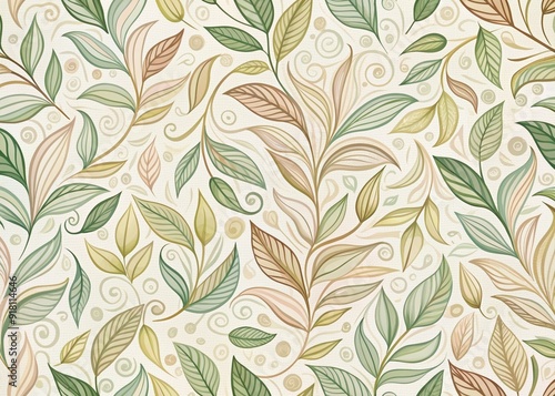 Delicate, hand-drawn leaves swirl and twirl in an organic, flowing seamless pattern, featuring natural repeats of gentle curves and soft, earthy tones.
