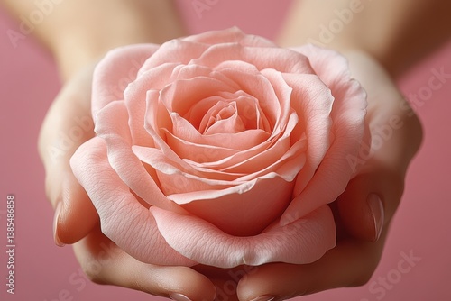 Delicate hands presenting a soft pink rose against a pastel background in a serene setting