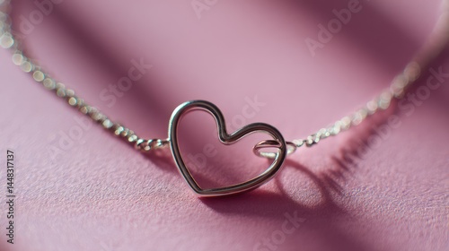 Delicate heart-shaped pendant necklace, close-up on a soft pink background. A silver heart charm hangs from a delicate chain. Soft light creates a gentle shadow