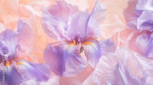 Delicate Iris flowers on a pink and purple translucent shimmer background. Close up.