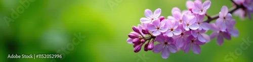 Delicate lilac branch, purple blooms against vibrant green spring foliage, springtime, spring