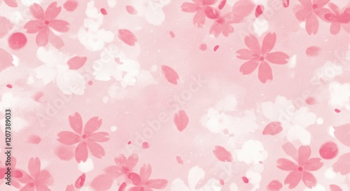 Delicate pink and white cherry blossom pattern with petals on soft background