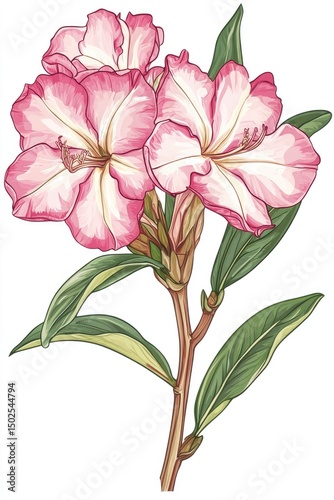 Delicate pink and white flowers with lush green leaves. A detailed illustration of a flowering branch, showcasing intricate petal details and vibrant colors