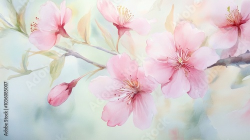 flower, pink, blossom, cherry, sakura, bloom, floral, nature, spring, botanical, delicate, soft, pastel, art, watercolor, painting, artwork, illustration, artistic, beautiful, fragile, pretty, elegant, romantic, blooming, lush, flower, tree branch, branching, bud, green, leaf, light, sunlight, background, sharpened, blur, colours