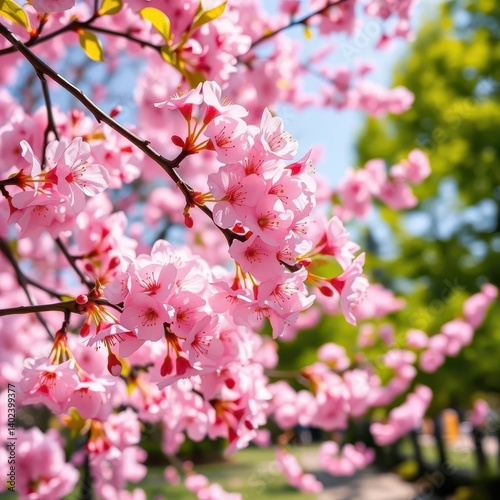 Delicate pink cherry blossoms gently sway in a sunlit garden, flora, calm, background