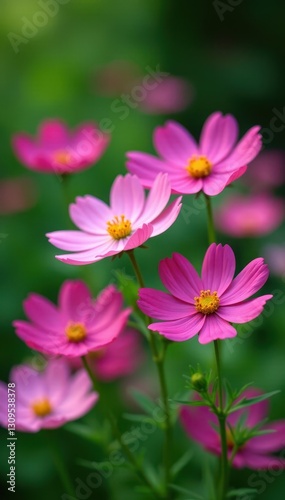 Delicate pink cosmos flowers in full bloom, vibrant against a lush green garden backdrop , sunlight, fresh