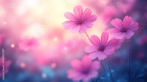 Delicate pink cosmos flowers in soft, pastel colors, with a blurred background of bokeh lights