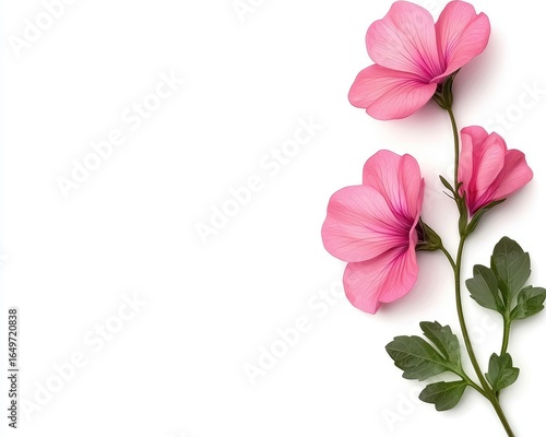 flower, pink, flower petals, blossom, bloom, floral, plant, green, leaf, stem, white, background, isolated, delicate, soft, fresh, beauty, nature, simple, minimalist, spring, summer, natural, bright, light, shadow, elegant, beautiful, pretty, detail, texture, closeup, flora, botanical, decorative, ornament, arrangement, art, design, pattern, cut, copy, space, vertical, diagonal, growth, tender, bud, open
