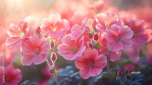Delicate Pink Geranium Blooms in Soft Morning Light with a Dreamy Garden Background