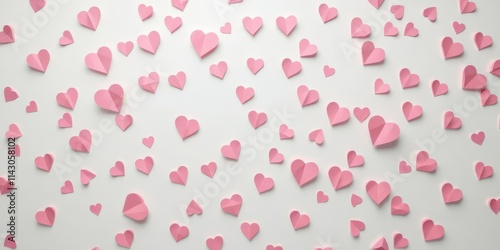 Delicate pink paper hearts confetti scattered on white background, whimsical, pastel