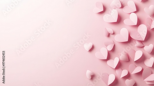 delicate pink paper hearts scattered across pastel pink background soft shadows and subtle texture create depth and romance in minimalist valentines day composition