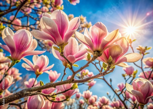 Delicate pink petals unfurl from buds on a majestic magnolia tree, set against a soft blue springtime sky with gentle sunlight filtering through the leaves.