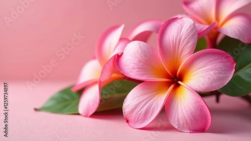 Delicate Pink Plumeria Blossoms on a Soft Pink Background, a Close-Up Image Showcasing the Intricate Details of the Petals and the Gentle Curves of the Flowers