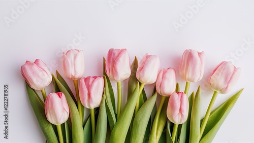 Delicate pink tulips arranged in a horizontal row on a white background with vibrant green leaves gracefully framing the floral display