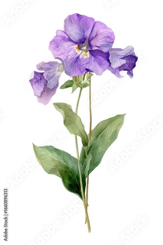 flower, purple, bloom, floral, botanical, watercolor, illustration, nature, plant, stem, leaf, green, detail, delicate, soft, pastel, art, painting, iris, high-coloured, artistic, vintage, closeup, isolated, white, background, spring, summer, beauty, design, pretty, elegant, natural, organic, image, single, detailed, decorative