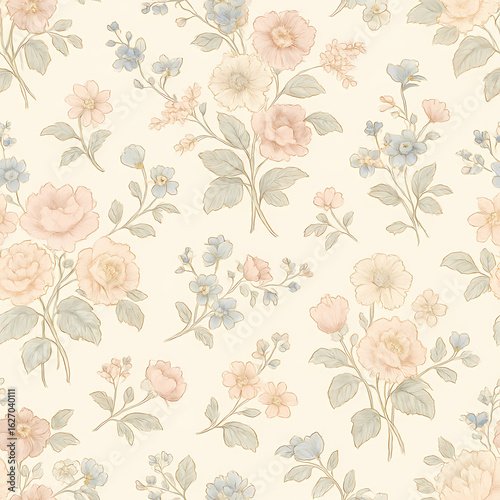 Delicate seamless floral pattern with pastel pink, blue, and peach flowers.