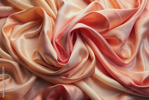 Delicate silk fabric with soft, romantic peach, coral, and rosa hues, featuring intricate folds and subtle sheen, evoking elegance and sophistication.