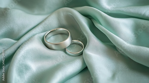 Delicate silver stacking rings on silky mint green cloth, bright light and airy composition