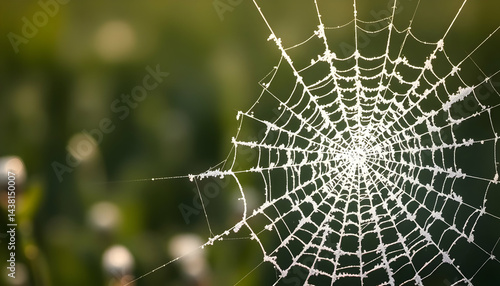 Delicate Spiderweb With Dewdrops Under Sunlight