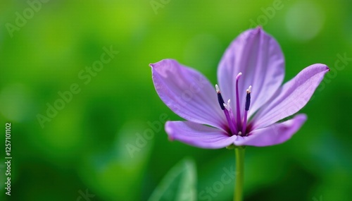 Delicate violet flower with clear stamens on a lush green background, green, purple, colors
