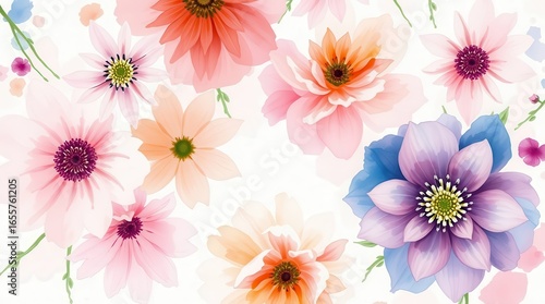 flower, floral, watercolor, pastel, pink, orange, purple, blue, white, soft, dreamy, romantic, spring, delicate, digital, art, illustration, background, pattern, design, bloom, blossom, stem, leaf, artwork, painting, garden, flora, vibrant, cheerful, fresh, beautiful, elegant, gentle, light, airy, aethereal, lovely, charming