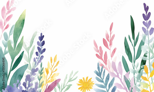 Delicate watercolor floral border design featuring pastel-colored leaves and flowers, perfect for invitations, cards, or digital backgrounds.