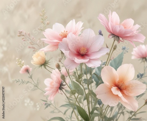 Delicate watercolor flowers in soft pastel hues on a neutral background, spring, flowers, neutral background