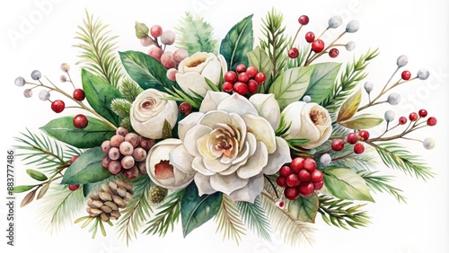 Delicate watercolor illustration of serene winter bouquet featuring white blooms, rustic pine branches, and luscious crimson berries on creamy background.