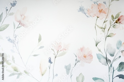 Delicate watercolor painting of pale pink flowers and green leaves on a white background.